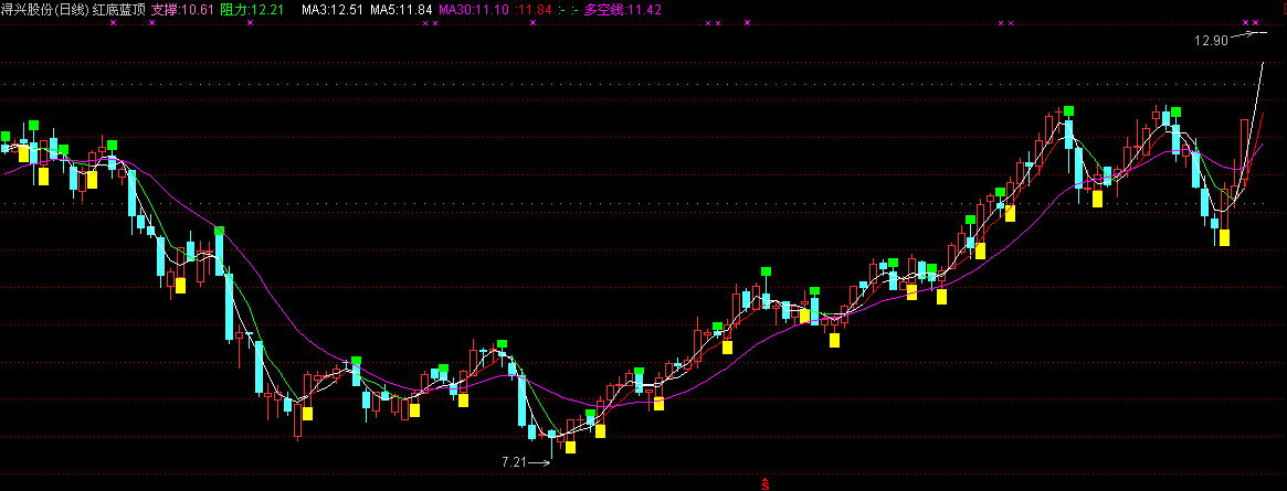 - 多空线:(20*X+19*REF(X,1)+18*REF(X,2)+17*REF(X,3)+16*REF(X,4)+15*REF(X,5)+14*REF(X,6)
