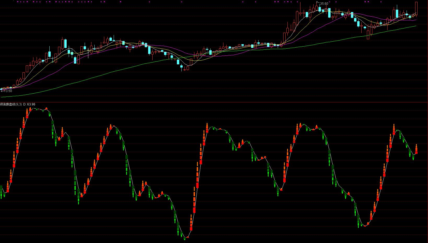 相关简介:通达信领涨操盘线副图源码 领涨操盘线 {N 1 100 9 M 1 100 3} LOWV:=LLV(LOW,N); HIGHV:=HHV(HIGH,N); RSV:=EMA((CLOSE-LOWV)/(HIGHV-LOWV)*100,M); K:=EMA(RSV,M); D:MA(K,M); STICKLINE(KD,(K-D)*0.85+D,(K-D)+D,0.5,0),COLOR00F000; STICKLINE(KD,(K-D)*0.65+D,(K-D)*0.8+D,1,0),COLOR
