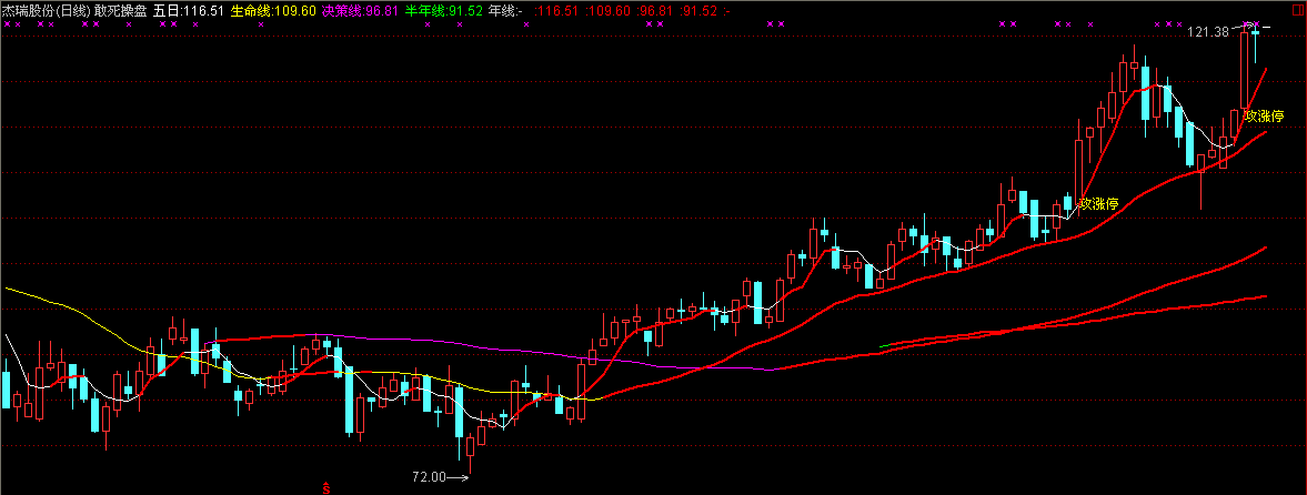 相关简介:通达信敢死队操盘主图指标公式 敢死操盘主图指标公式,源码如下: 五日:MA(CLOSE,5); 生命线:MA(CLOSE,24); 决策线:MA(CLOSE,72); 半年线:MA(CLOSE,133); 年线:MA(CLOSE,200); Y:=CLOSE/REF(CLOSE,1)1.07; X:=VOLMA(VOL,5); A1:=Y AND X; DRAWTEXT(A1,MA(CLOSE,5),'攻涨停'),COLORYELLOW; IF(MA(CLOSE,5)=REF(MA(CLOSE,