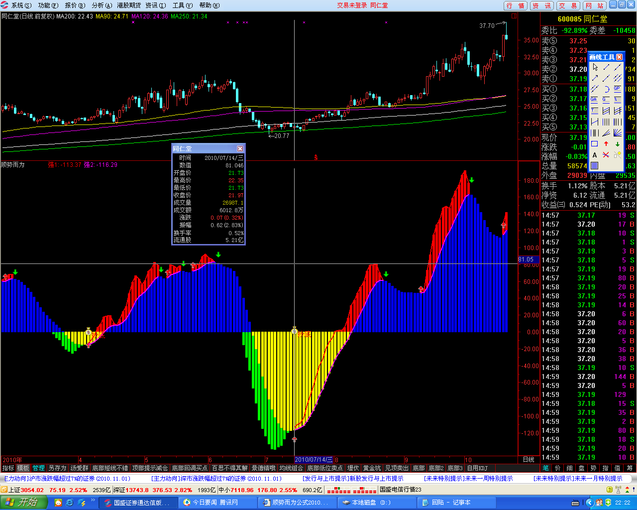 - 绿柱消失买入:STICKLINE(DIFF<0,0,DIFF,2,0),COLOR00FF00;