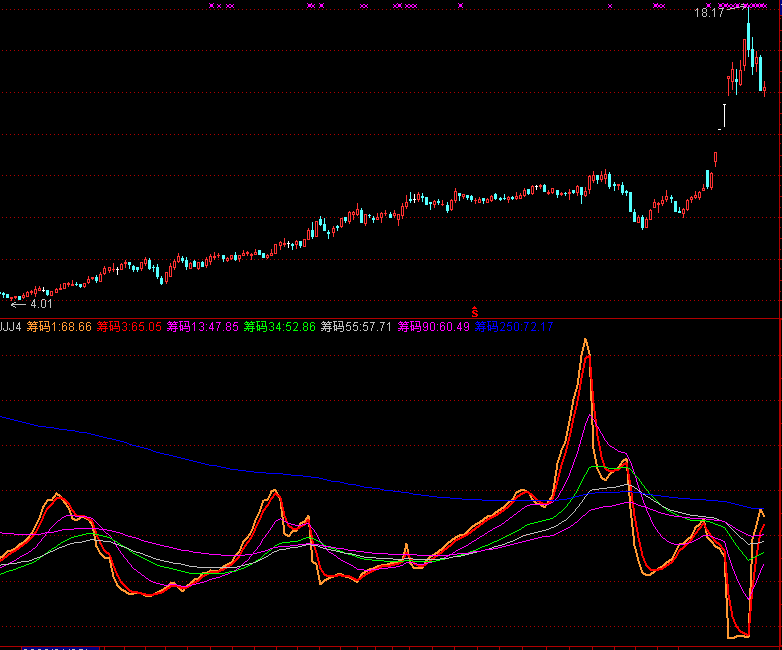 3、使用时,每一条短周期的筹码线上穿长周期的筹码线,均是筹码收集的过程,上穿角度越大,筹码收集越快,表明有强庄位于其中。