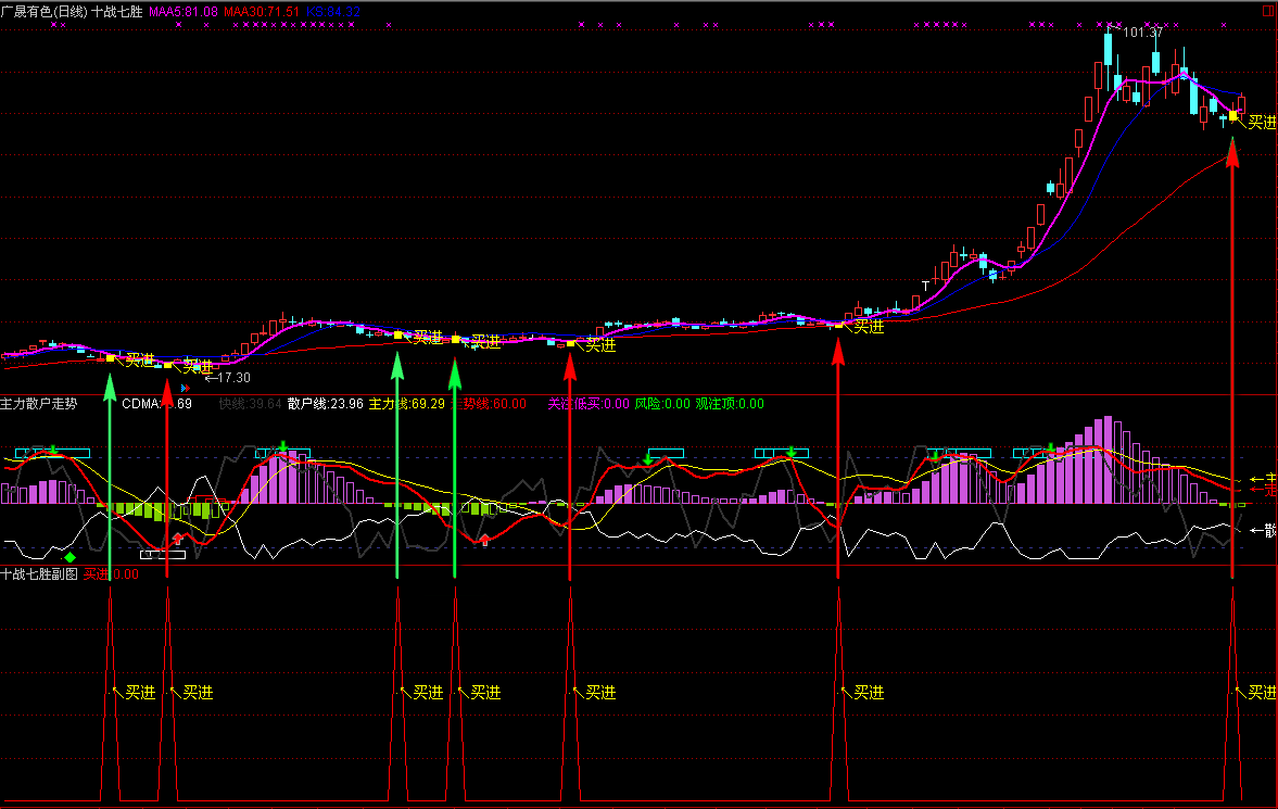 DRAWTEXT(FILTER(买=1,5),LOW-0.05,'↖买进'),COLORYEL