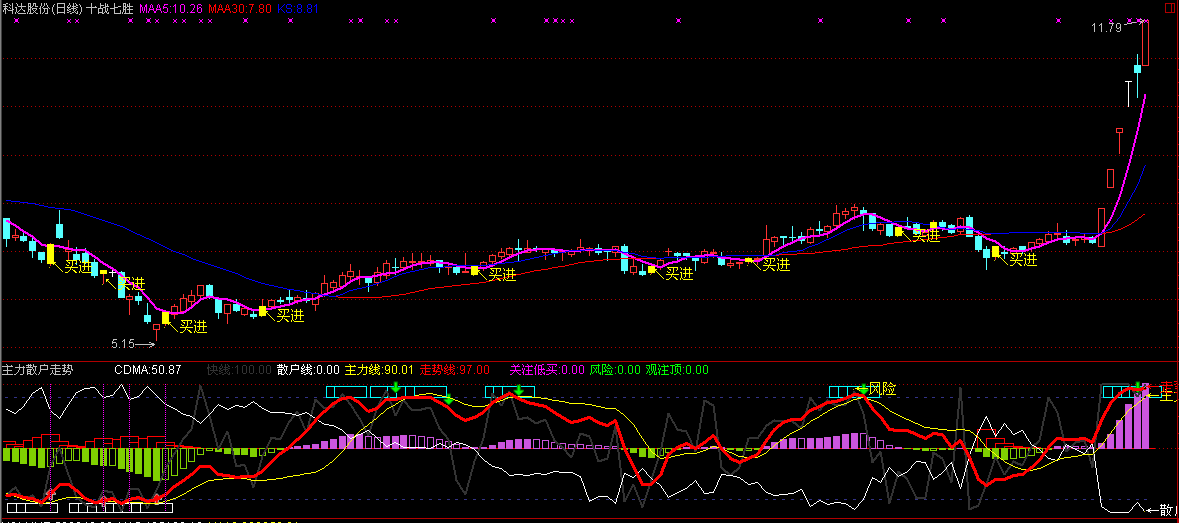 - 关注低买:IF(90>散户 AND CROSS(90,散户) ,98,0),COLORMAGENTA,STICK,NODRAW;