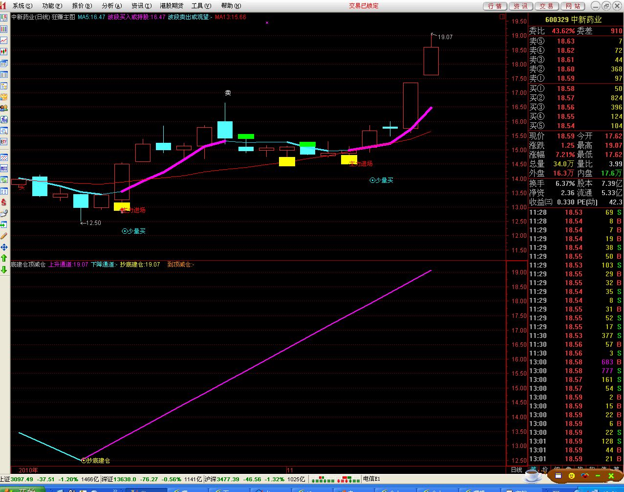 - 抄底建仓:IF(上升通道>REF(上升通道,1),上升通道,N),NODRAW,COLOR00FFFF;
