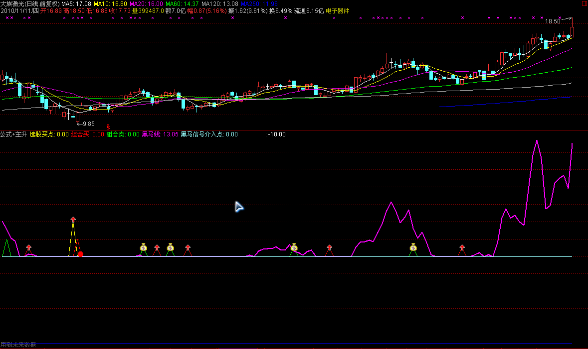 - DRAWTEXT(VAR17,1.3,'发现黑马'), , COLORFF6600;