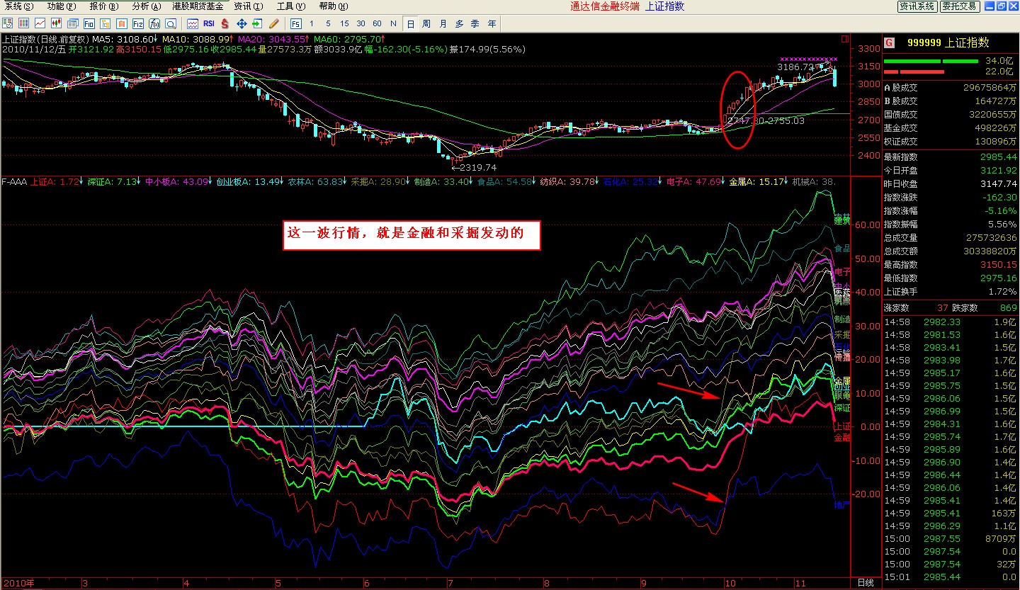 - 上证A:SUM((("999999$C")/REF(("999999$C"),1)-1)*100,0),COLORRED,LINETHICK3;