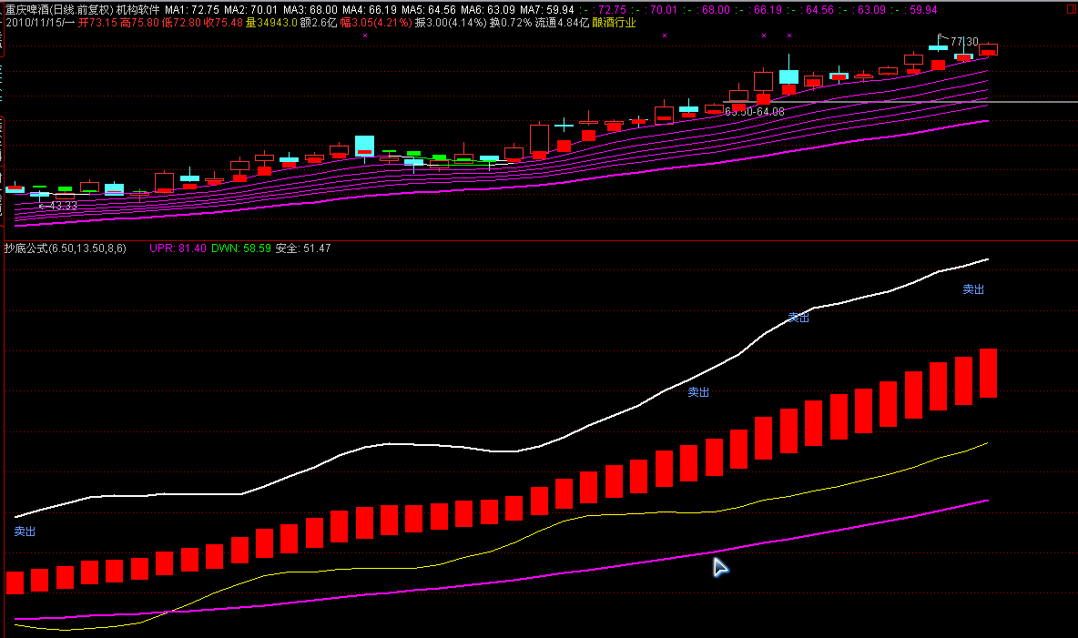 - DRAWTEXT(CROSS(下线,上线),H*1.02,'☆卖出'),COLORMAGENTA;