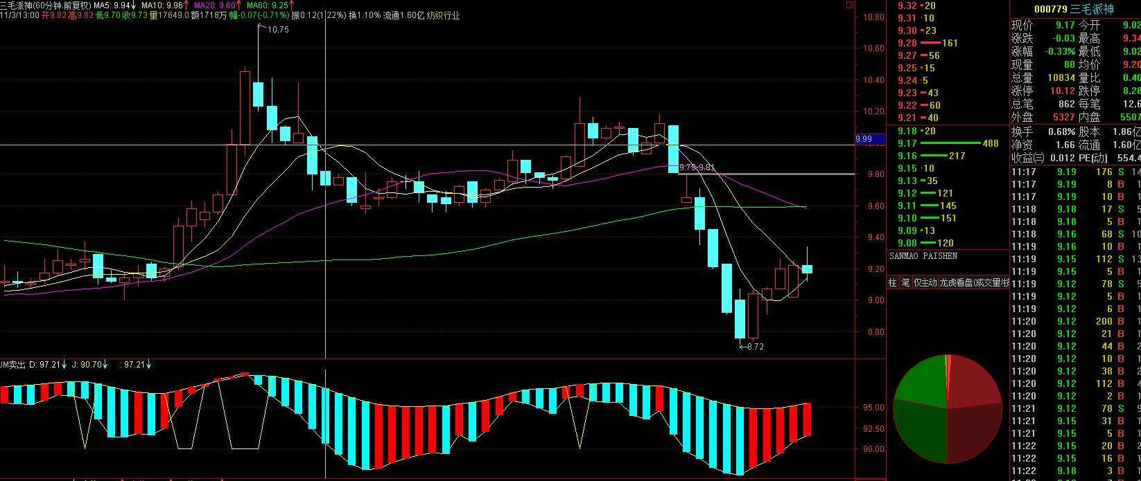 相关简介:通达信获利出场副图源码 {公式在线提供: www.gszx.com.cn } 刚刚升到初一,奉献原创的逃顶公式,没有未来。信号指标是论坛淘来的,可以做为参考。用法自己体会,我自从创造出此指标后就从来没有被套过。 C/C++ Code 复制内容到剪贴板 RSV:=(HHV(HIGH,9)-CLOSE)/(HHV(HIGH,9)-LLV(LOW,9))*100; K:=(SMA(RSV,3,1))/4; D:100-(SMA(K,3,1))/4; M:=(SMA(K,3,1))*0