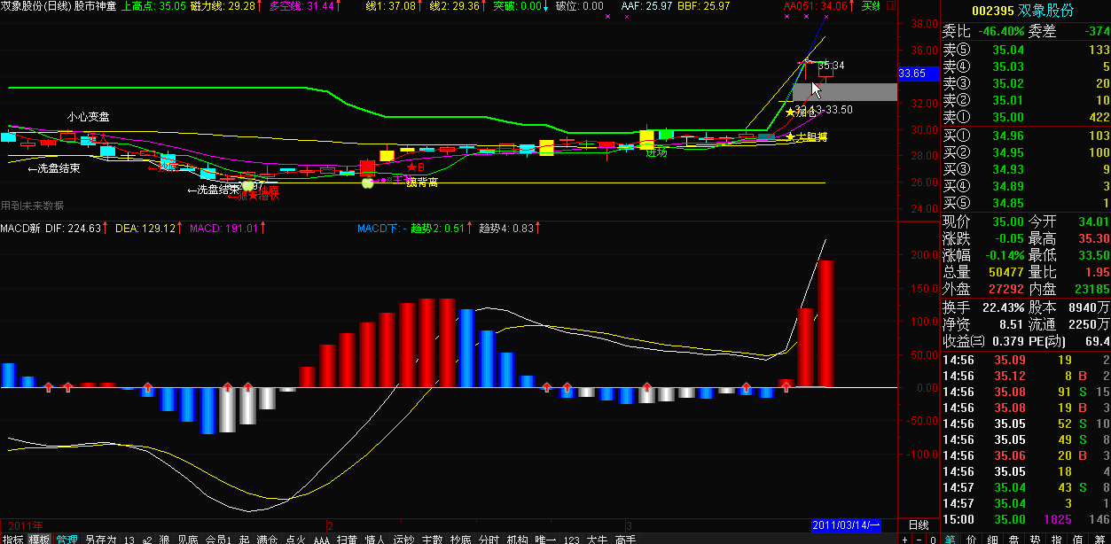 相关简介:通达信MACD新趋势买入提示副图源码 {公式在线提供: www.gszx.com.cn } 非常感谢一叶D知秋提供的飞狐公式指标分享,我在你的指标中,加入趋势买入。 VC:=(REF(C,2)*REF(V,2)+REF(C,1)*REF(V,1)+C*V)/(V+REF(V,1)+REF(V,2)); SQX:=(VC-MA(VC,13))*100; DIF:MA(SQX,5),COLORWHITE; DEA:EMA(DIF,5),COLORYELLOW; MACD:(DIF-DEA)*2,CO