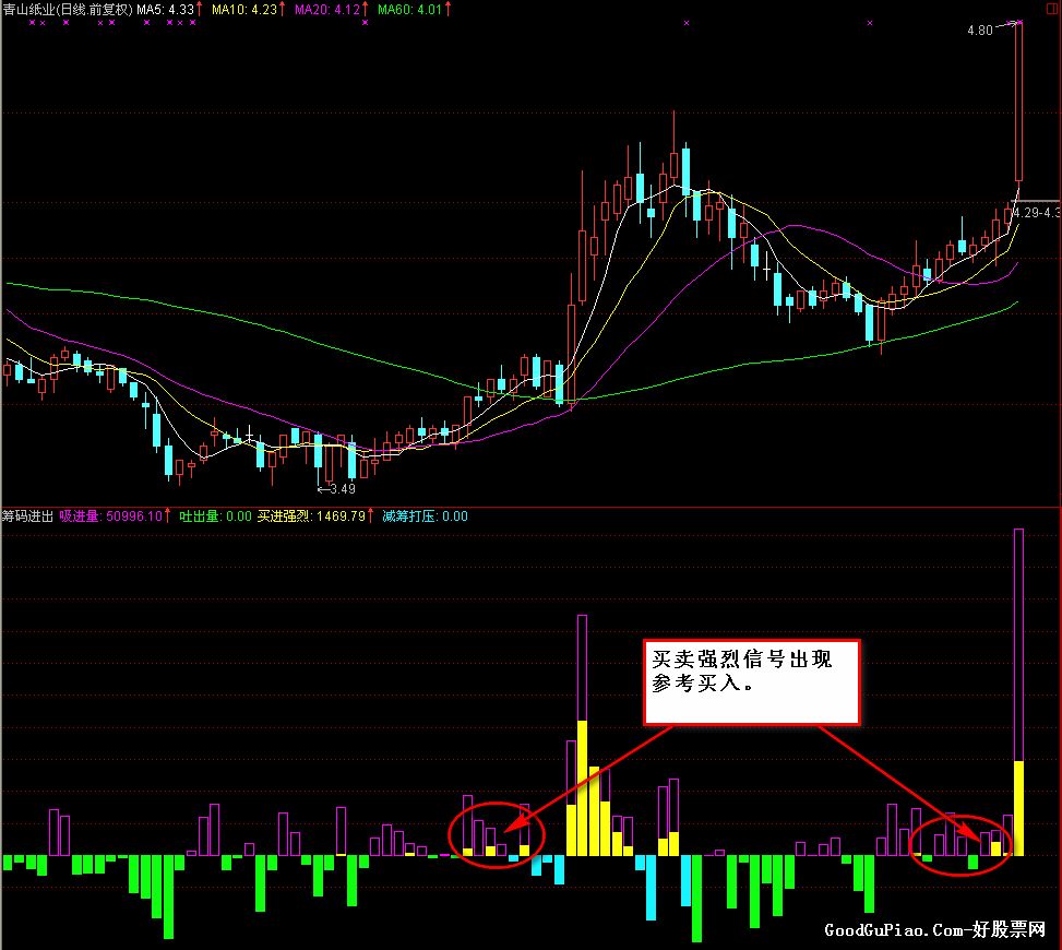 相关简介:通达信筹码进出源码 {公式在线提供: www.gszx.com.cn } 自用的指标推荐给大家,贴图有解。 第3行包含未来函数:capital, CAPITAL函数是当前流通股本,不会漂移。 通达信【筹码进出】(副图) VUR0:=(2*O+H+L+3*C)/7; VUR1:=CAPITAL*VUR0; VUR2:=SMA(AMOUNT,10,1)/1000; VUR3:=MA(C*3,5); VUR4:=VUR2*C*3/VUR3*1/10; VUR5:=VUR2*O*3/VUR3*1/10;