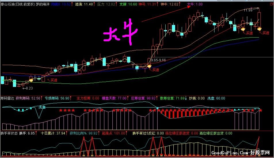 3.当追涨线,神马线,神牛线三线都在大行情线之上,则显示大牛,主图出现大牛的信号为:1 恭喜你。