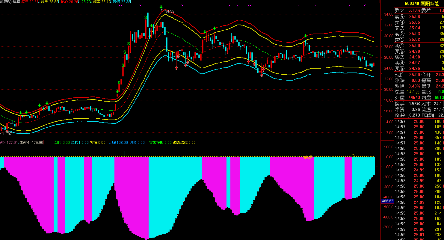 上下各有两条线,代表压力支撑的级别,中间的轴心线红持股,绿持币。买卖信号只是参考,不喜欢的把他删掉。