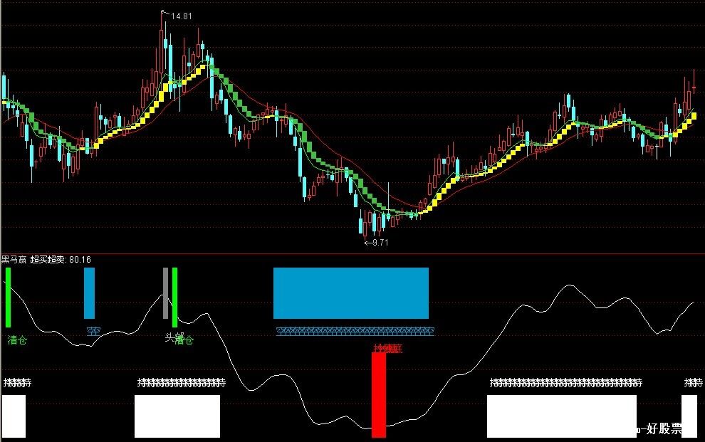 相关简介:通达信黑马赢家短线T+0源码、图 通达信黑马赢家短线T+0源码、图 V1:=(C*2+H+L)/4*10; V2:=EMA(V1,11)-EMA(V1,30); V3:=EMA(V2,5); V4:=2*(V2-V3)*4; 做空:= IF(V4=0,V4,0),COLORGREEN; 做多:= IF(V4=0,V4,0); V5:=(HHV(INDEXH,8)-INDEXC)/(HHV(INDEXH,8)-LLV(INDEXL,8))*8; V6:=EMA(3*V5-2*SMA(V5,18,1