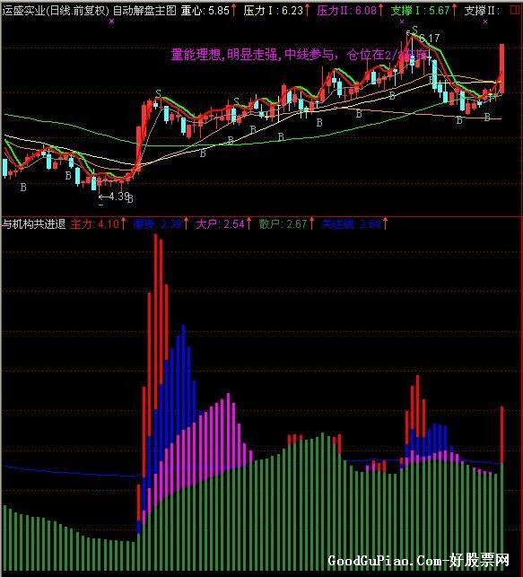 相关简介:通达信机构共进退副图公式源码 {公式在线提供: www.gszx.com.cn } A:=V*100/CAPITAL; 主力:MA(A,4),COLORRED,POINTDOT; 游资:MA(A,9),COLORBLUE,POINTDOT; 大户:MA(A,17),COLORFF00FF,POINTDOT; 散户:MA(A,34),COLOR238E23,POINTDOT; 关注线:MA(A,180),COLORBLUE,LINETHICK1; STICKLINE(主力0,0,主力,1,0),C