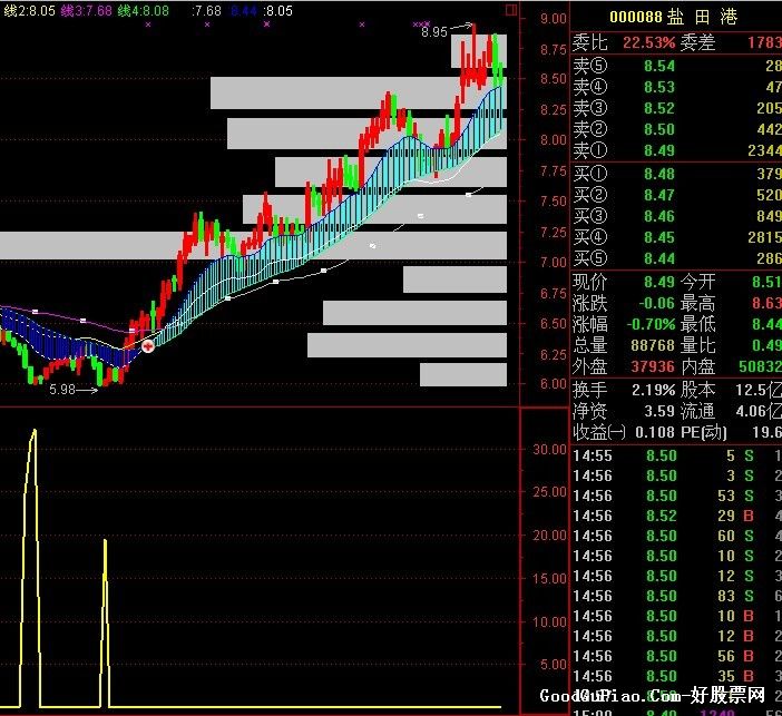 相关简介:通达信天下无敌之致命出击 {公式在线提供: www.gszx.com.cn } 源码如下: VAR1:=EMA(HHV(HIGH,500),21); VAR2:=EMA(HHV(HIGH,250),21); VAR3:=EMA(HHV(HIGH,90),21); VAR4:=EMA(LLV(LOW,500),21); VAR5:=EMA(LLV(LOW,250),21); VAR6:=EMA(LLV(LOW,90),21); VAR7:=EMA((VAR4*0.96+VAR5*0.96+VAR6
