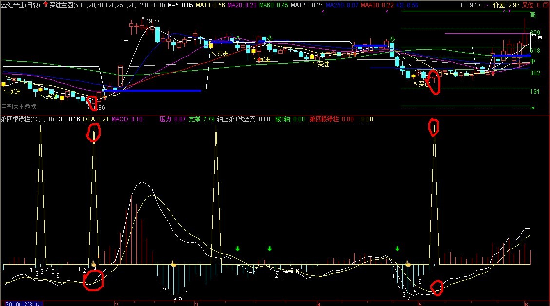 相关简介:通达信短线操盘好指标副图源码 第四根绿柱动态底部》{公式在线提供: www.gszx.com.cn } 本指标经过本人再次优化,并跟踪实盘操作效果不错,特别适合短线操作。特别感谢飞鱼老师的再次指点! 指标使用说明:当看到DIF线上穿DEA,同时出现黄色指示时,短线可以根据压力位和支撑位的提示买入。图中红圈划出的为有效信号。 源码: {动态底部 顸誓N=1 120 13,M=1 120 3,P=30 30=P50}; DIF:EMA(CLOSE,6)-EMA(CLOSE,13); DEA:EMA(