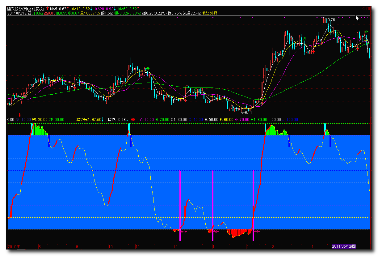 - DRAWTEXT(CROSS(趋势线,底),底,'杀庄'),COLORLIMAGENTA;