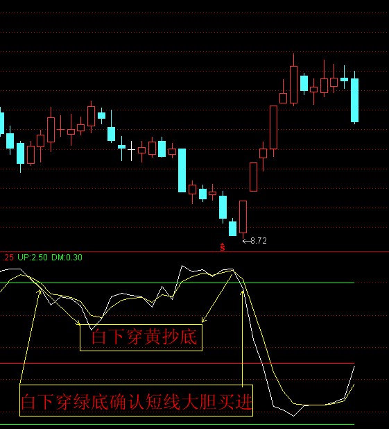 两条指标线在绿线附近缠绕筑底。大于绿线,白线下穿黄线——激进可买,保守可在白线下穿绿线底部确认买。不足,牛股启动指标有失真现象。只供参考,不可太依耐。