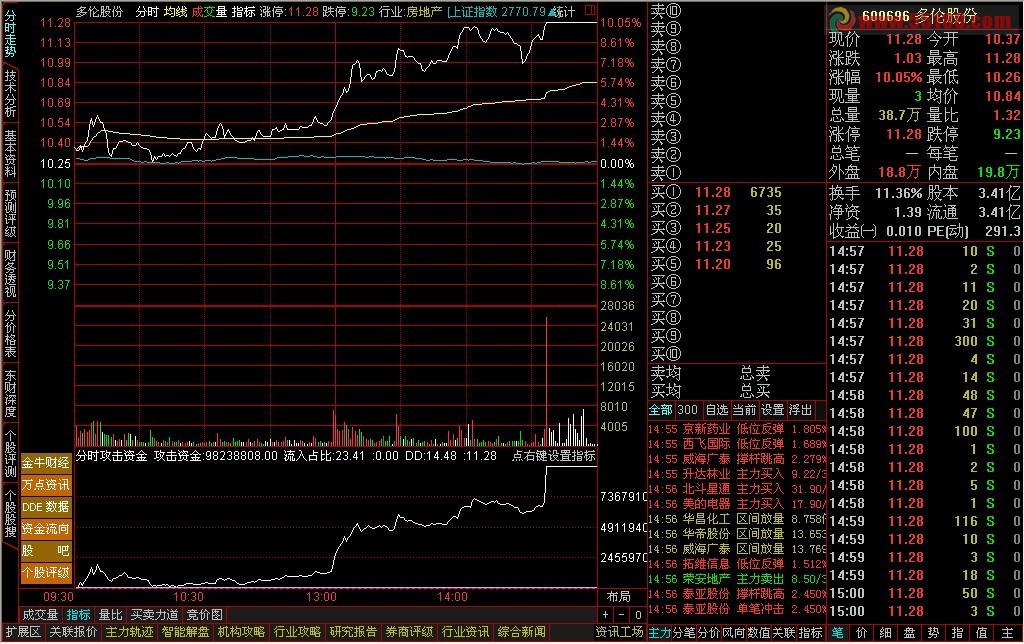 相关简介:通达信分时攻击资金无未来副图源码 SSA:=IF(CREF(C,1),AMOUNT,0); SSB:=IF(CREF(C,1),AMOUNT,0); 攻击资金:SUM(SSA,0)-SUM(SSB,0); 总额:=SUM(AMOUNT,0); 流入占比:(攻击资金)/总额*100; 0,DOTLINE; 攻击量:=MA(V,5)*1.382/54,COLORGREEN; DD:REF(攻击量,1); O; {公式在线提供: www.gszx.com.cn } 早上开盘后白线在零线上方运行,流入占