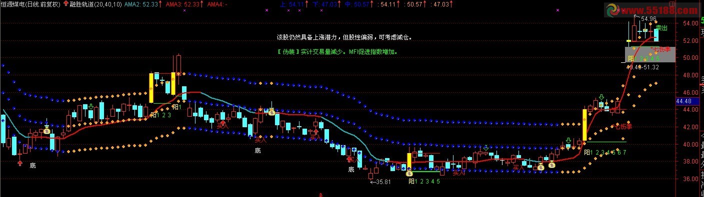上升:=IF(红轨道>=绿轨道,绿轨道,DRAWNULL),COLORRED,LINETHICK2;