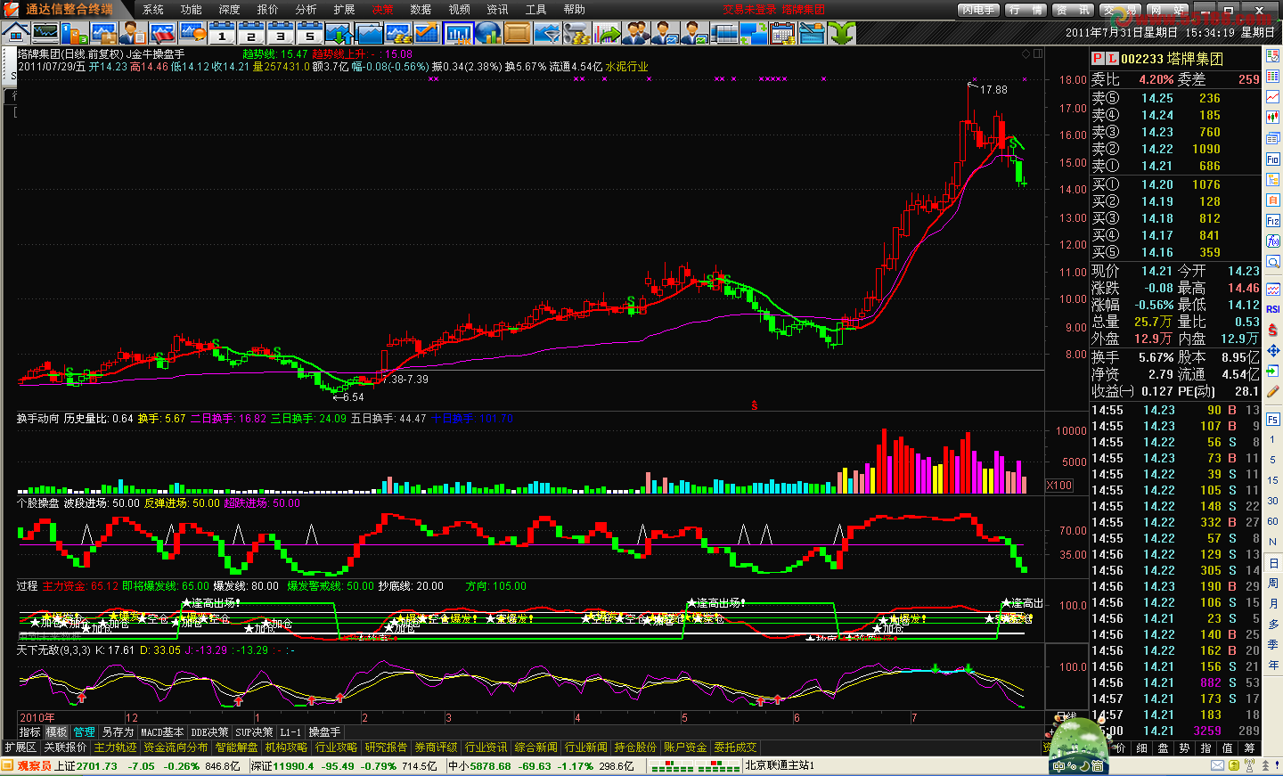 相关简介:通达信从上到下看清楚源码 指标分别来自理想论坛 我把它们排在一图里 没做任何贡献如果给你感觉有一点用 我就很开心了 {公式在线提供: www.gszx.com.cn } J金牛操盘手 换手动向 个股操盘 软件里有我就不发了