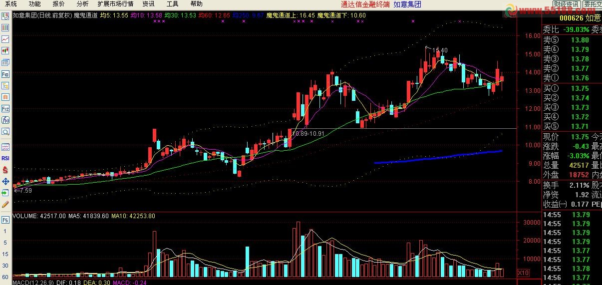 相关简介:通达信魔鬼通道指标主图源码 看论坛上有人的主图使用了这个指标,特贴出源码,供大家参考。{公式在线提供: www.gszx.com.cn } 这个主图指标有很多变种形式,但最基本得就是这几条线。魔鬼通道指标可以判断大盘个股短,中,长期重要阻力位和支撑位。 魔鬼通道指标公式: 均5:MA(CLOSE,5) COLORYELLOW; 均10:MA(CLOSE,10) COLORMAGENTA; 均30: MA(CLOSE,30) COLORgreen; 均60: MA(CLOSE, 60) color