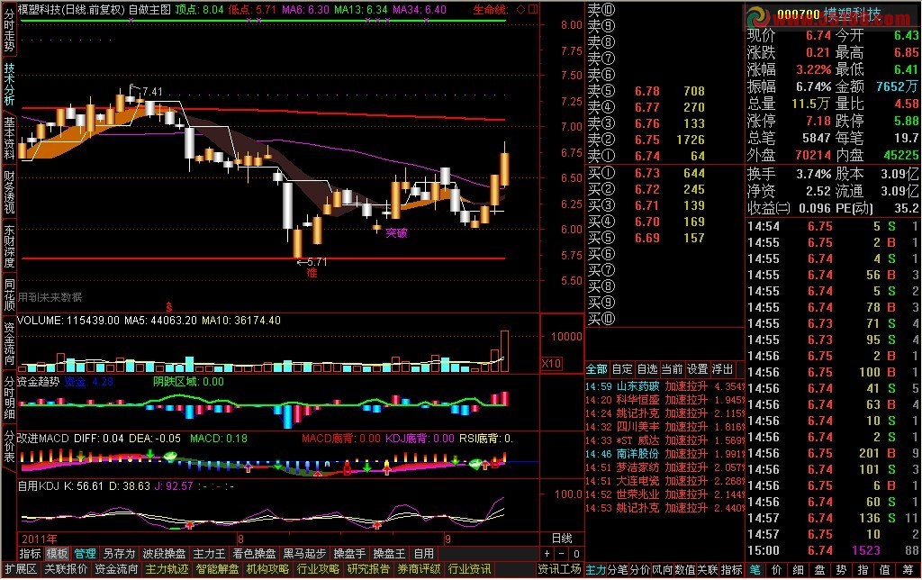 相关简介:通达信资金趋势指标源码副图 A:=VOL*CLOSE; B:=SUM(A,1)/SUM(VOL,1); B1:=EMA(B,5);{公式在线提供: www.gszx.com.cn } 资金:(B-B1)*100/B,COLORBLUE; STICKLINE(资金REF(资金,1),0,资金,3,0),COLORFF6600; STICKLINE(资金REF(资金,1),0,资金,2,0),COLORFF9900; STICKLINE(资金REF(资金,1),0,资金,1.2,0),COLORFF