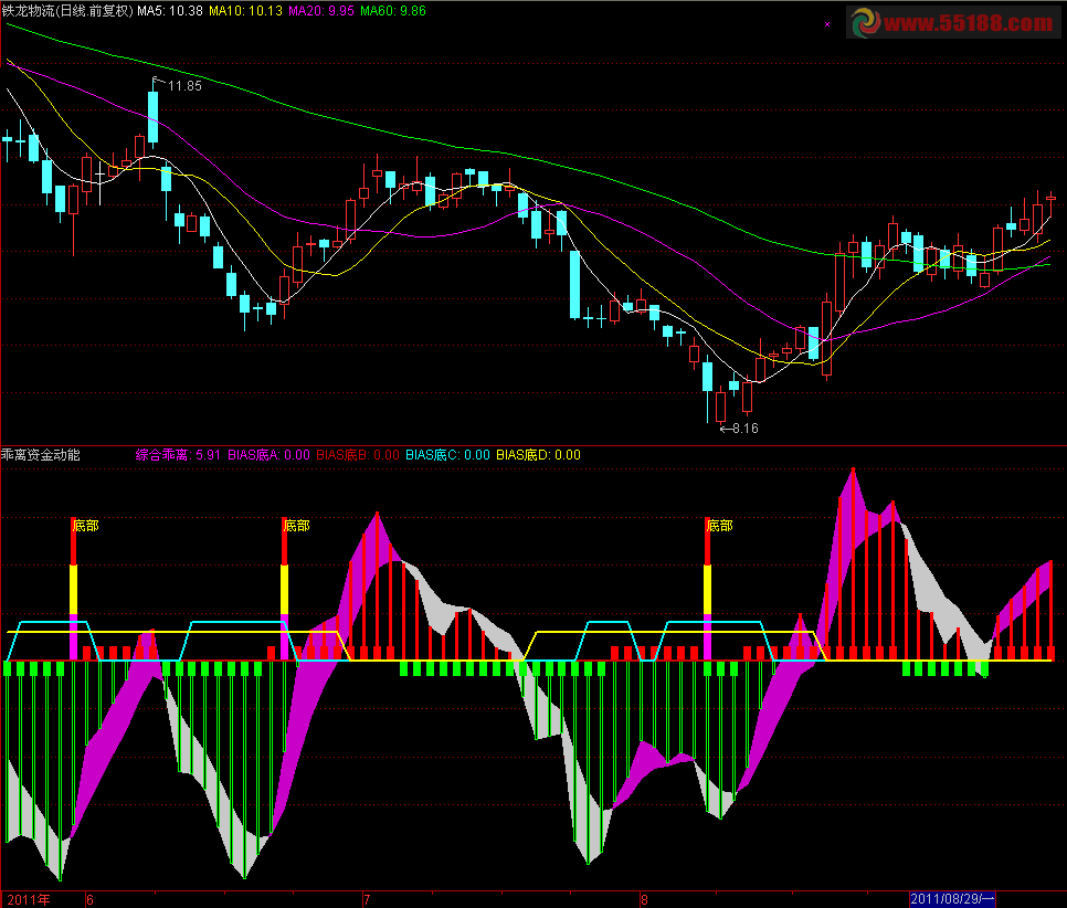 该指标提示买卖点较明显(分别以资金动能的彩带变化提示买卖点,或三色彩柱提示底部买入点,以及用乖离改型指标分4级提示底部区域),同时在0轴上下以小红,小绿柱分别表示可持股或持币区域,为小散们提供了简洁,明了。清晰的操盘时机或点位。