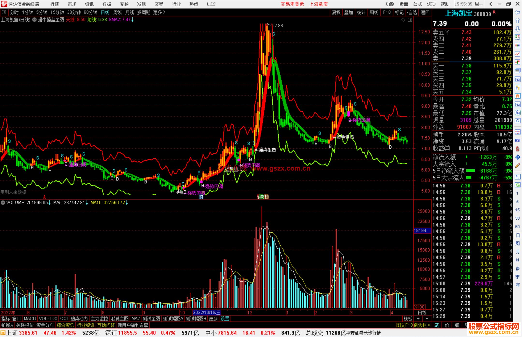 相关简介:M:=1; 天线:(MA(CLOSE,M) * 1.15),COLOR0000FF,LINETHICK2; 地线:(MA(CLOSE,M) * 0.85),COLOR00FF80,LINETHICK2; B1:=MA(CLOSE,1); B2:=SMA(SMA(SMA(B1,2,1),2,1),2,1) ; SMA2:MA(B2,4),NODRAW; DRAWBAND(B2,RGB(250,0,0),SMA2,RGB(0,180,0)); A:='LTFUNC4@FORLT2'; S1:='LT