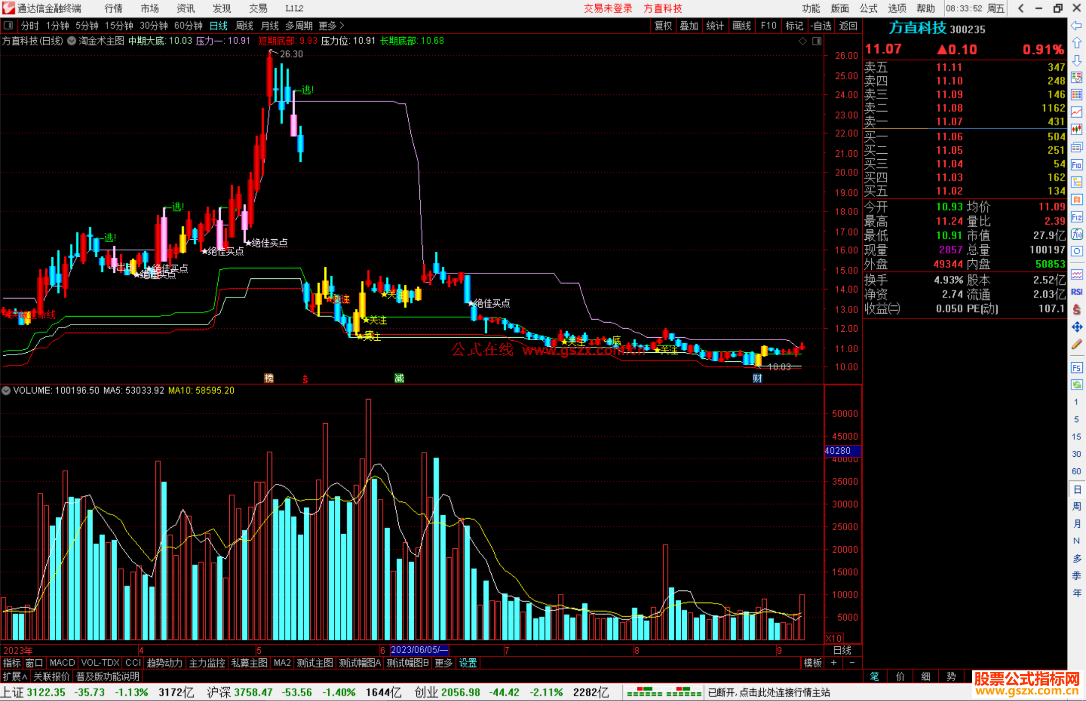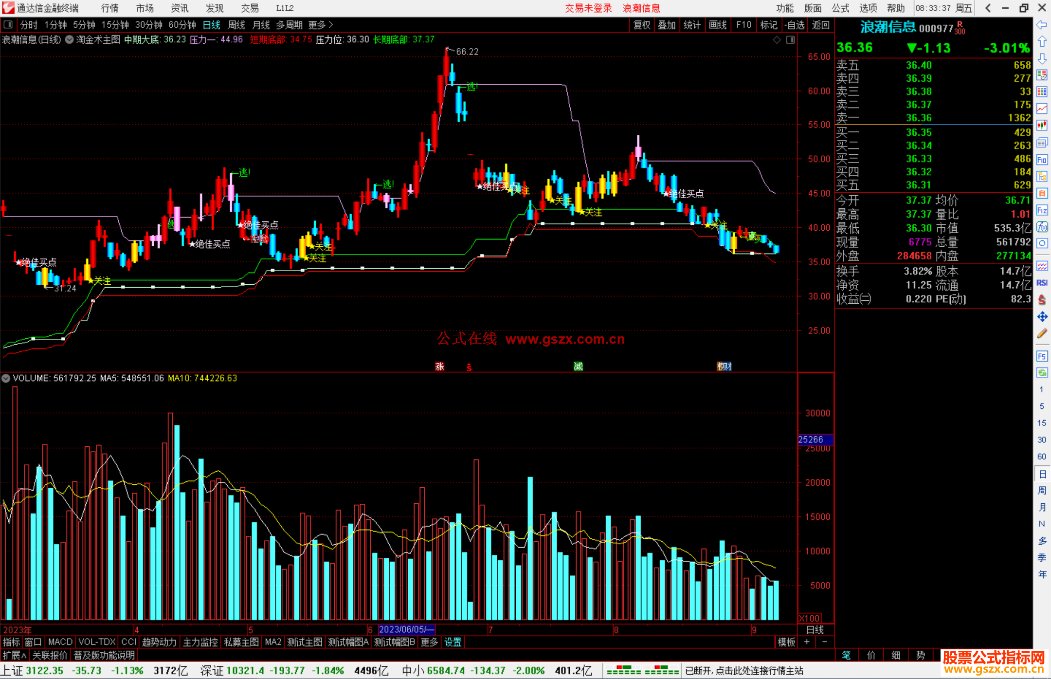 DRAWTEXT((((((((CLOSE - REF(HIGH,1)) > 0)) AND ((中线 - REF(中线,1)) > 0)) AND (HIGH <= 压力一)) AND (CLOSE < MA20)) AND (LOW <= 中线)),(LOW - 0.06),'★关注'),COLORYELLOW;