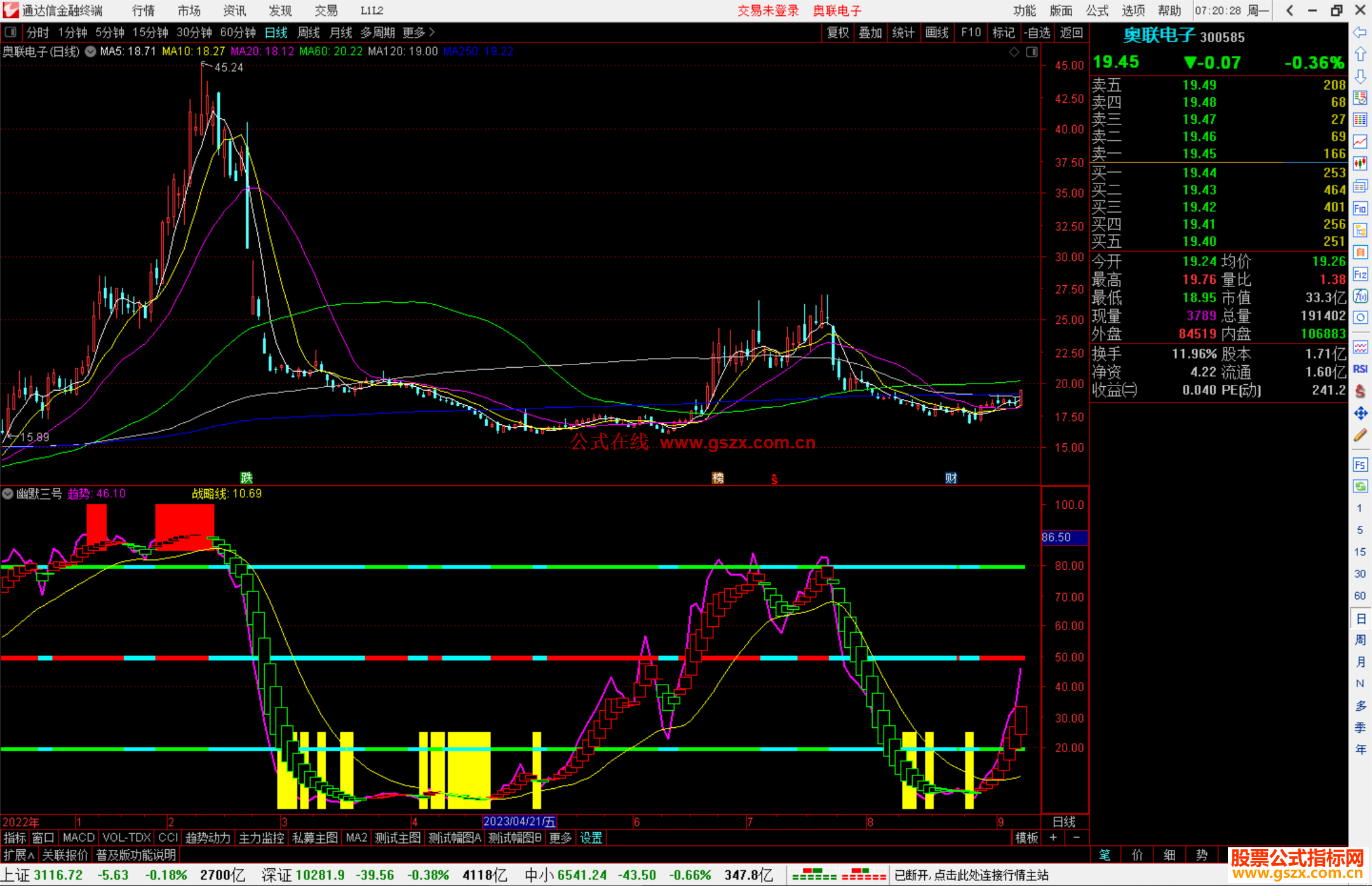 相关简介:VARA:=LLV(LOW,35); VARB:=HHV(HIGH,30); VARC:=EMA((CLOSE-VARA)/(VARB-VARA)*4,4)*25; 趋势: VARC,COLORFF00FF,LINETHICK2; 底背: STICKLINE(VARC10 AND 100*(HHV(HIGH,14)-CLOSE)/(HHV(HIGH,14)-LLV(LOW,14))97,0,25,5,0),COLORYELLOW; 顶背: STICKLINE(VARC90,100,85,10,0