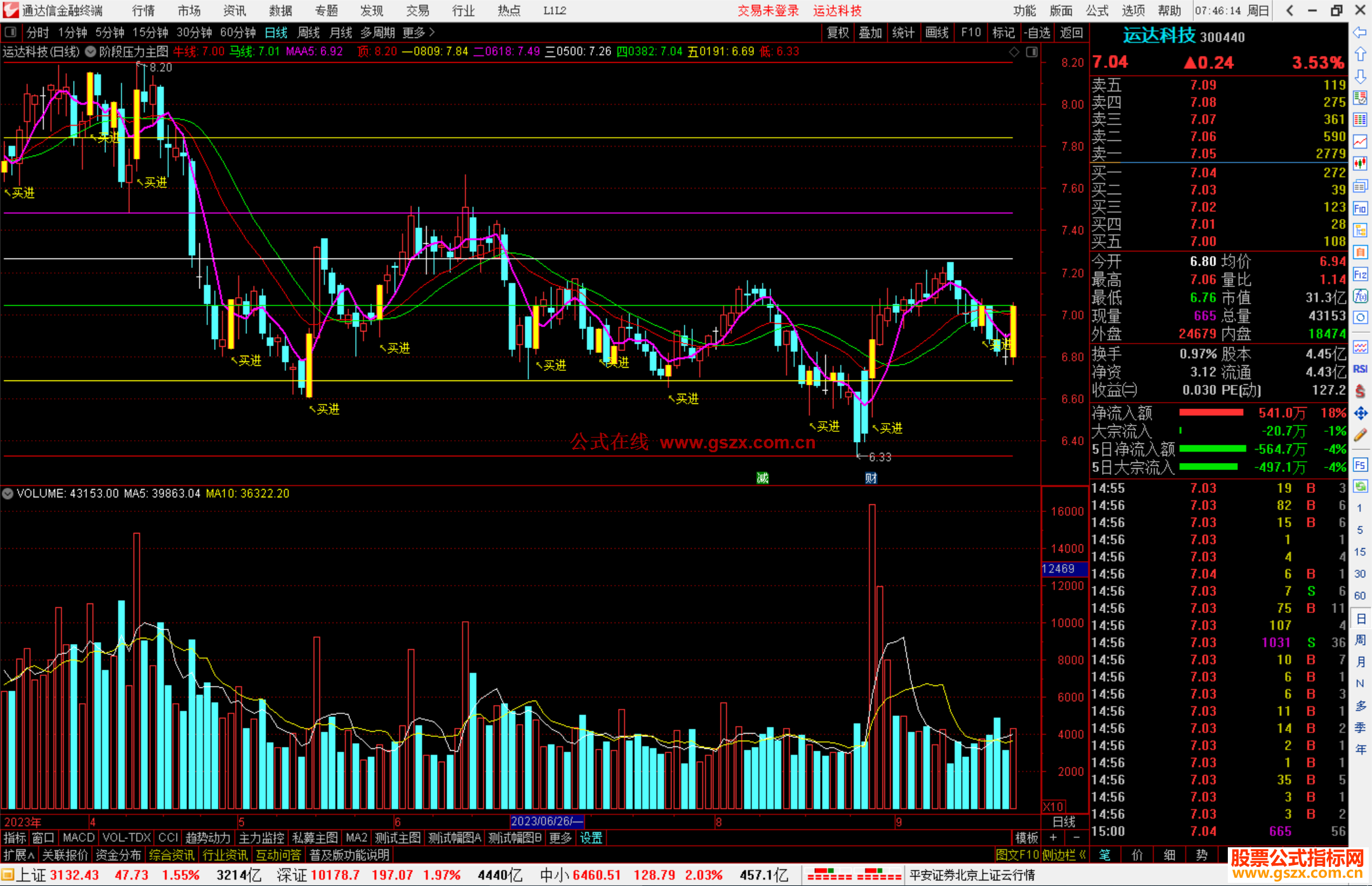 DRAWTEXT(FILTER(买=1,5),LOW-0.05,'↖买进'),COLORYELLOW;