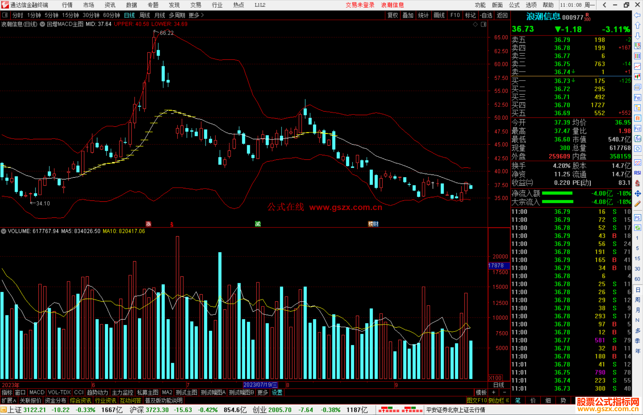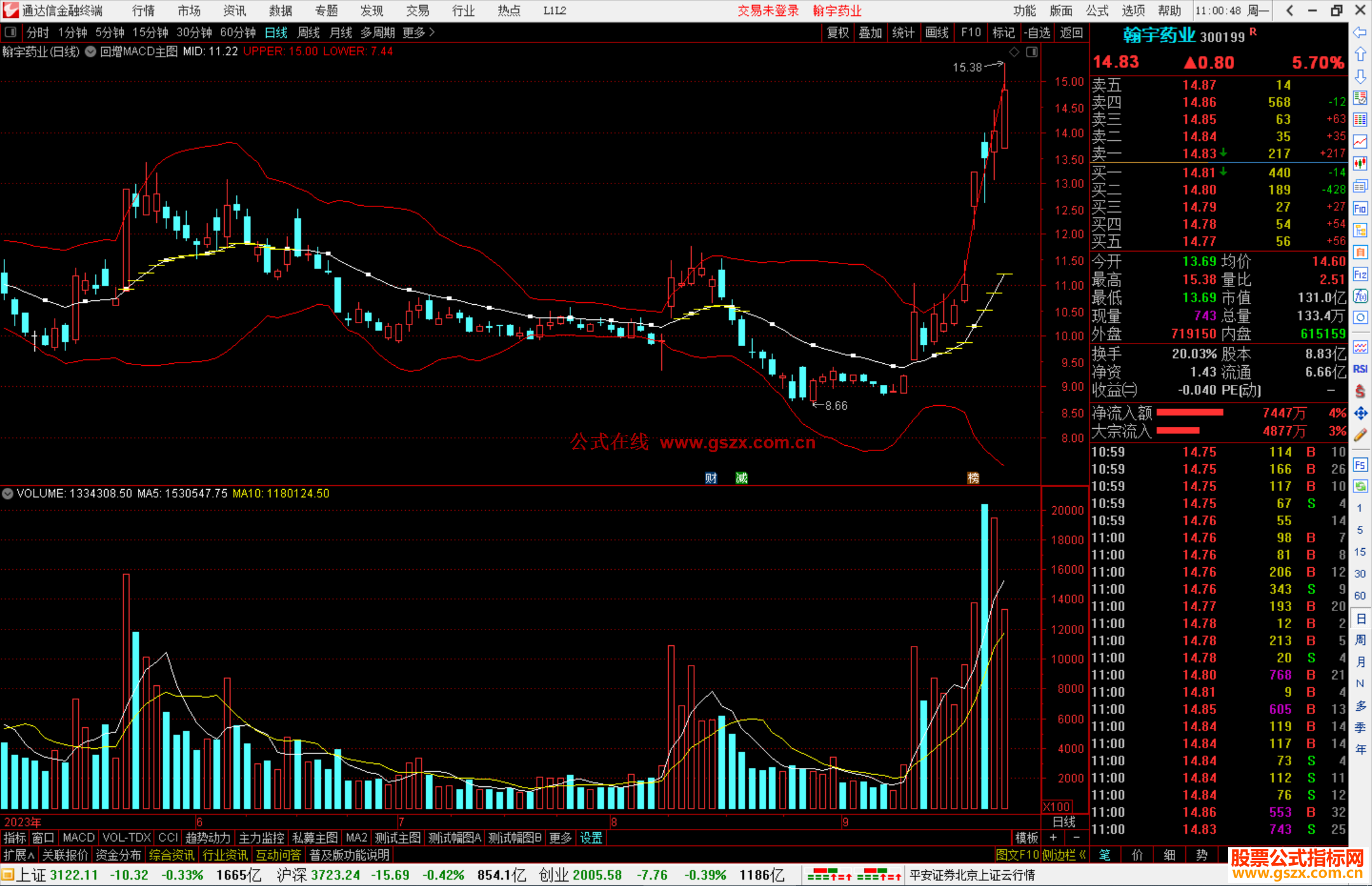 相关简介:MID:EMA(C,20),LINETHICK1,COLORWHITE; UPPER:MID + 2*STD(C,20),LINETHICK1,COLORRED; LOWER:MID - 2*STD(C,20),LINETHICK1,COLORRED; H1:=EMA(SLOPE(CLOSE,34)*20+CLOSE,75); H2:=EMA(CLOSE,8); VAR1D:=H2-H1; A:=(3*C+L+O+H)/6; B:=(20*A+19*REF(A,1)+18*REF(A,2)+17