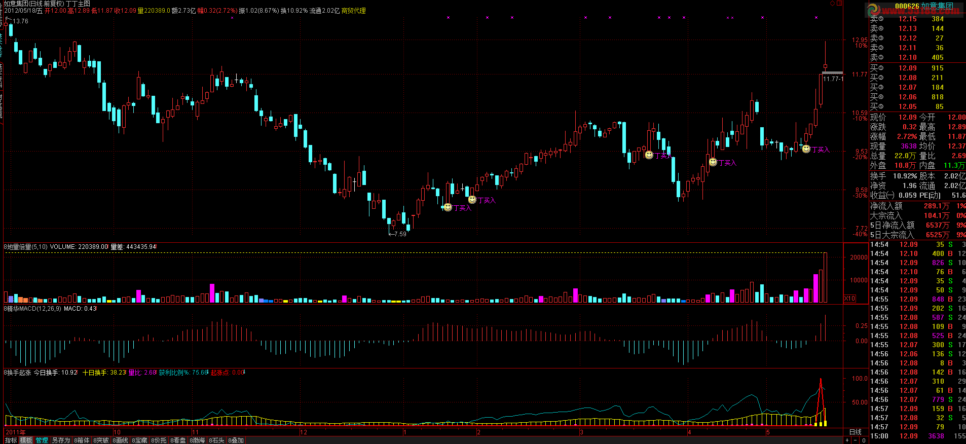 {洋红柱阳倍量,鲜绿柱阴倍量;浅蓝柱20日地量;深蓝柱30日地量;浅黄柱60日地量;黄柱120日地量。}