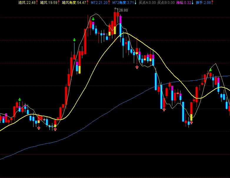 相关简介:看到有同学喜欢我的主图,故分享一下我拼凑的追风雄风主图,方便那些不熟悉代码的同学 本人是菜鸟,所有代码取于理想,感谢欧阳及老师及各位老师给我们提供这么好的东西 彩色K线代码我放前面,这样不会遮住均线 处于上升趋势的阴线柱体为红色 追风和雄风的用法就不用我说了,不会的去看看欧阳及老师的帖子 买卖点A:就是上下红绿箭头,是根据欧阳及老师发的一个买卖可靠度高的公式编的 买卖点B:就是K线上的黄色、紫色柱体,是根据欧阳及老师的裁决公式编的 当出现买卖点要结合追风和雄风线来操作 代码在附件中