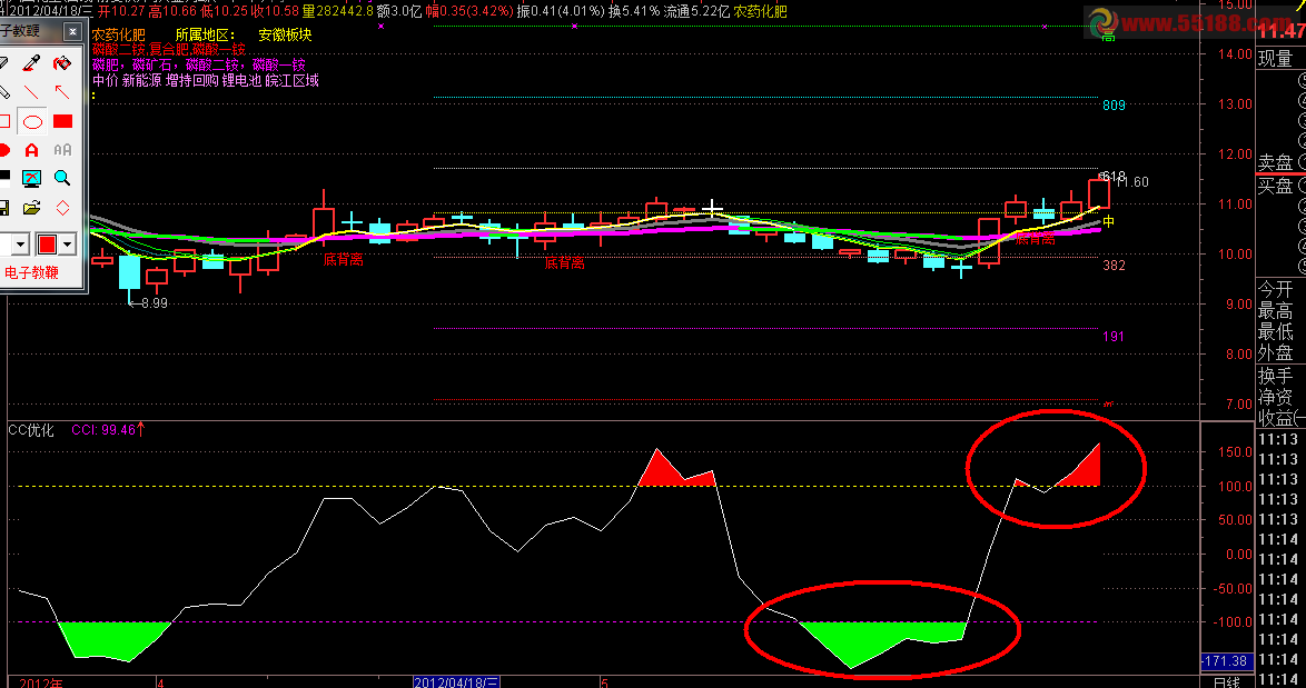 使用方法:绿色底部区域,红色操作区域;CCL上穿-100买入时机 ,CCL下破100卖出时机