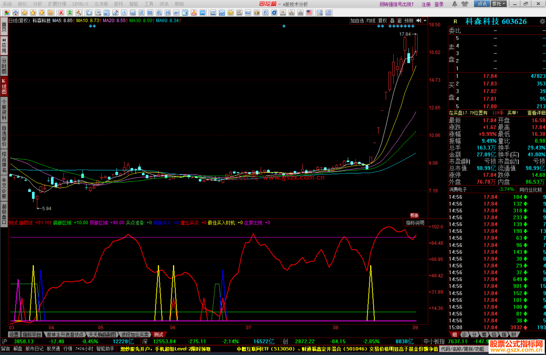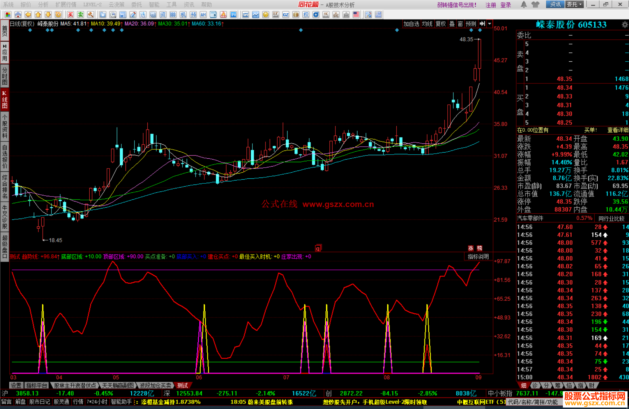 该指标的卖点相对来说比较简单,即趋势线运行上碰到顶部区域时,随时可以选择出货(此时如果伴随股价滞涨更佳)。