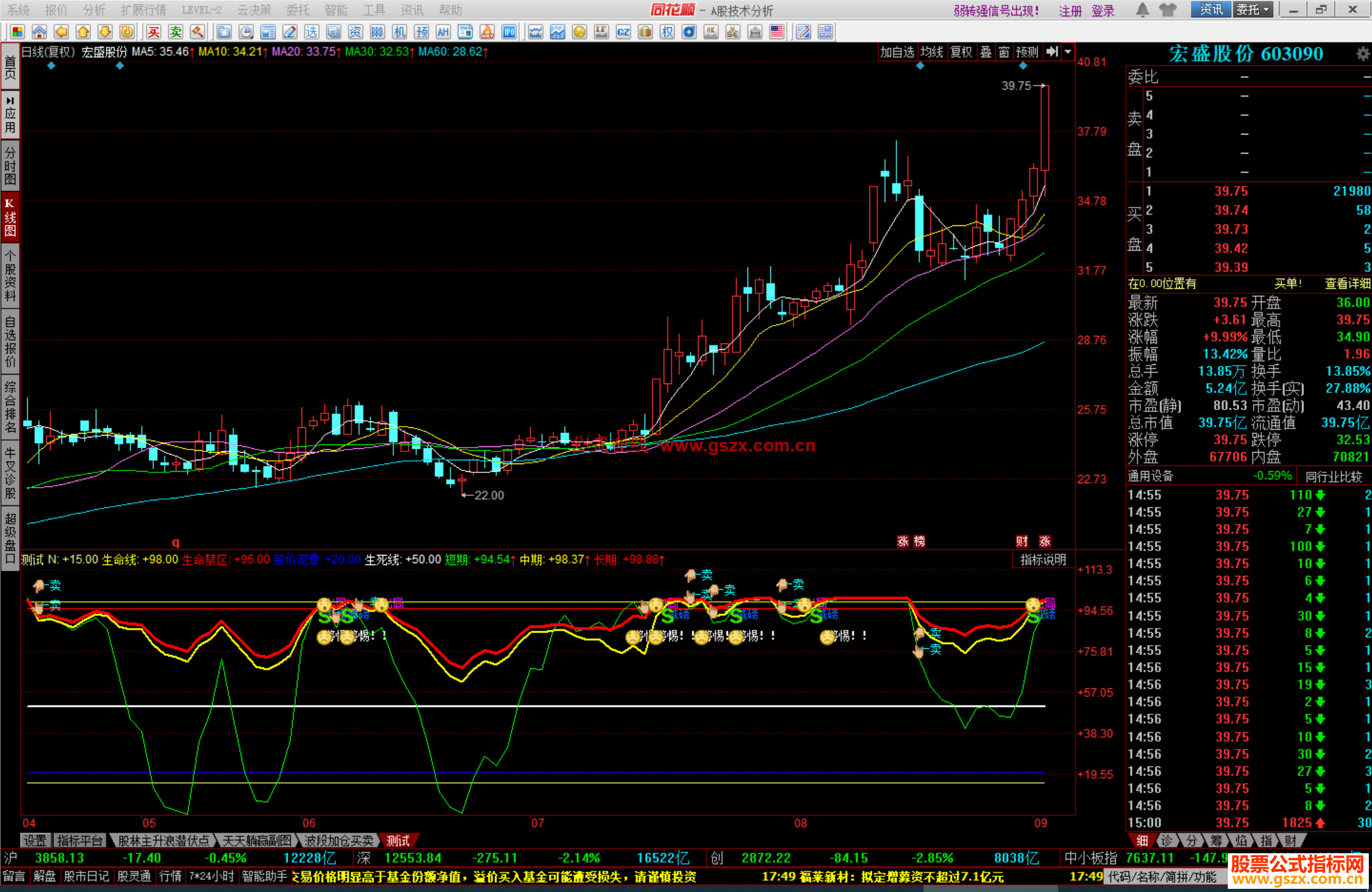 相关简介:同花顺股市黄金线副图指标 源码 N:15; 生命线:98,linethick1,coloryellow; 生命禁区:95,linethick1,colorred; 股价泥潭:20,linethick1,colorblue; 生死线:50,linethick2,colorwhite; C0:=(H+L+C)/3; a1:=HHV(C0,n); a2:=LLV(C0,n); a3:=a1-a2; a4:=EMA((C0-a2)/a3,2)*100; b1:=HHV(C0,4*n); b2:=LLV