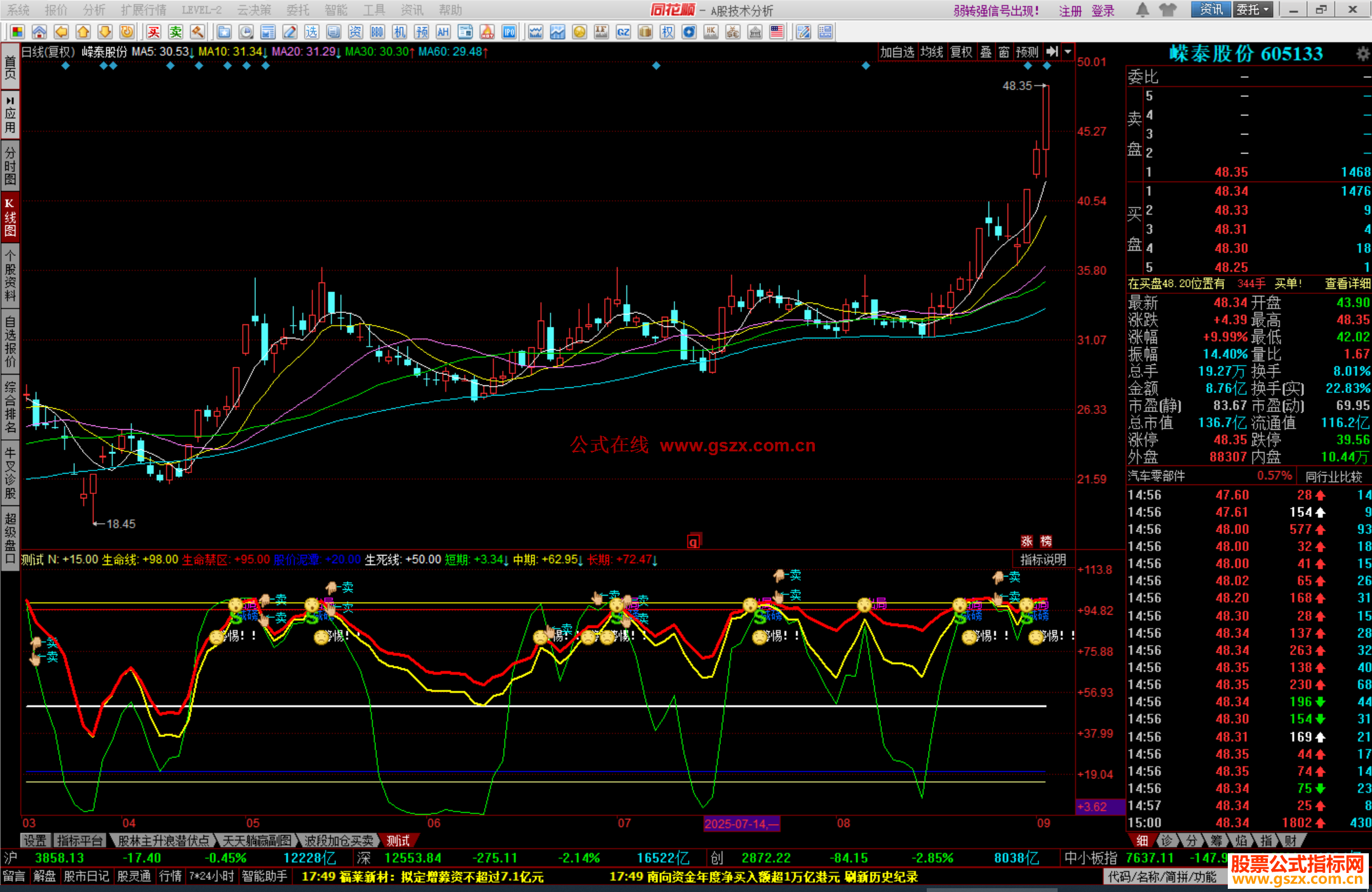 DRAWTEXT(CROSS(生命禁区,短期) AND REF(短期,1)>短期,短期*1.1,'←卖'), colorcyan;