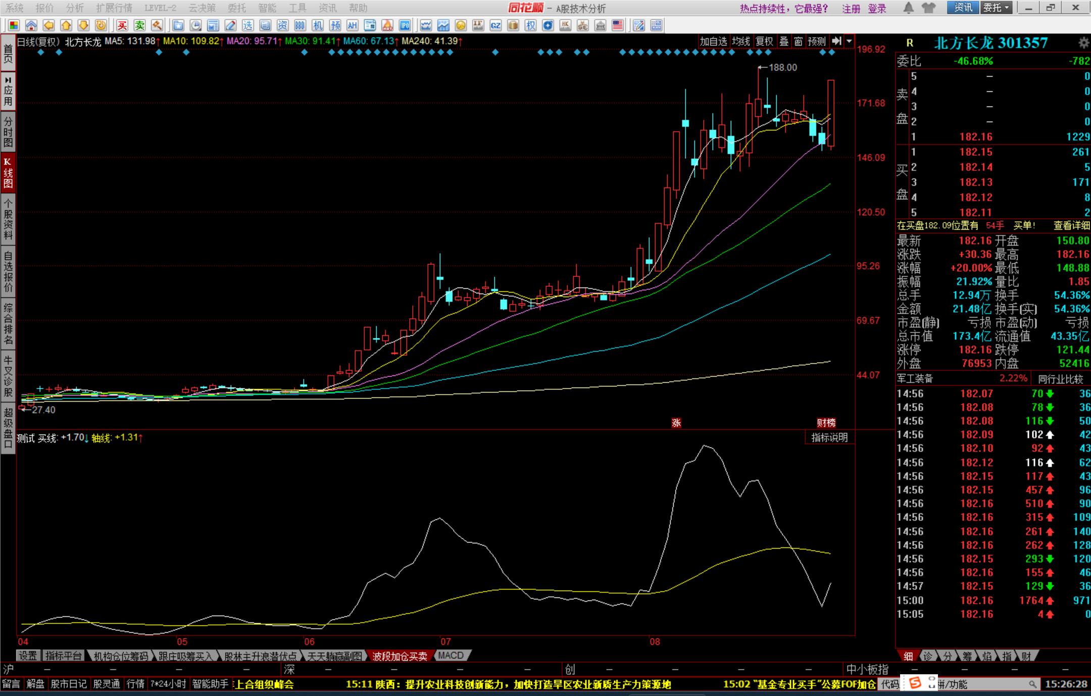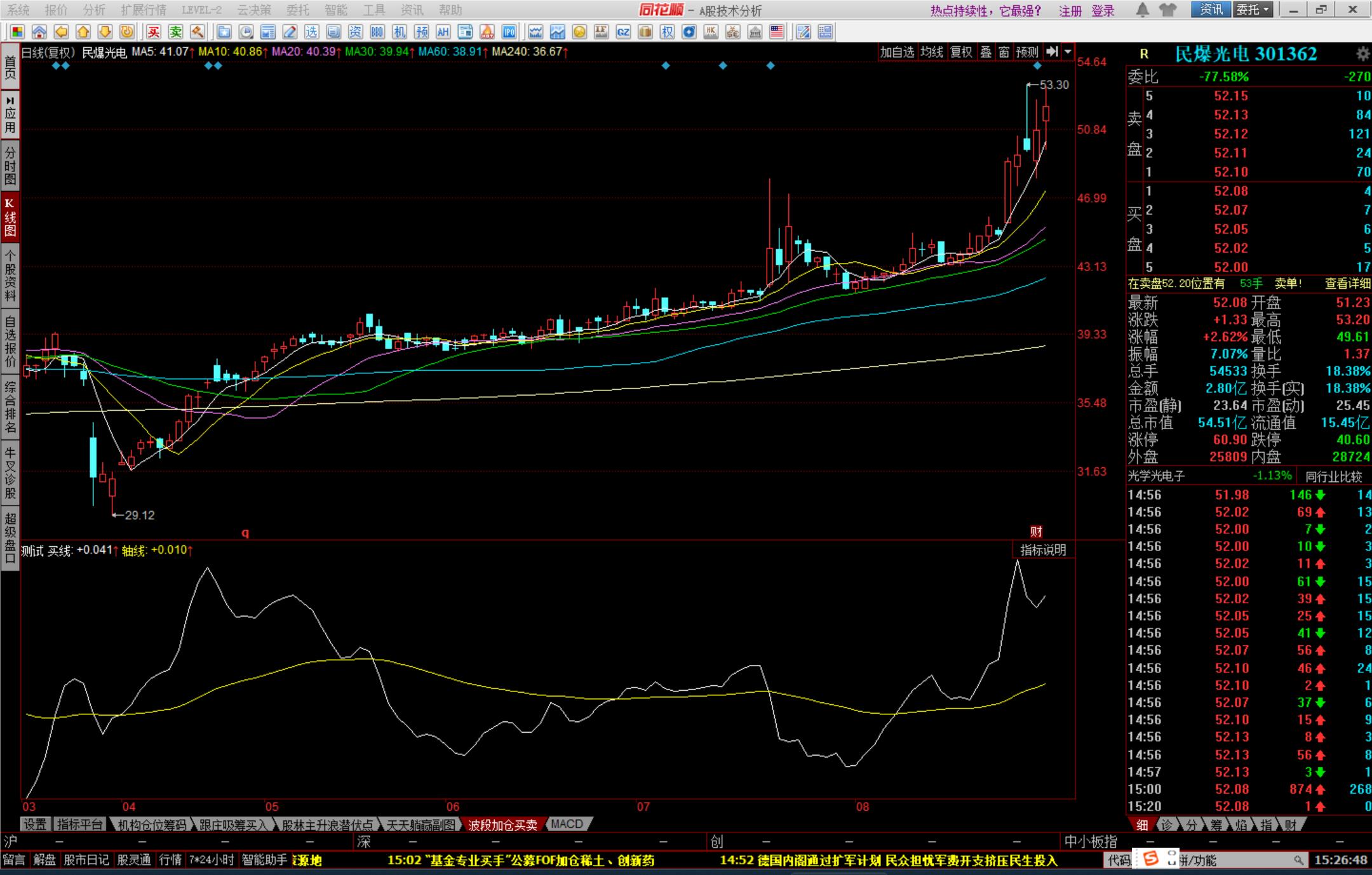 相关简介:A:=(C-L); R:=-(H-C); T:=SMA(A+R,5,1)/2; 买线:SMA(T,5,1), colorwhite,linethick1; 轴线:EMA(买线,50), coloryellow,linethick1;