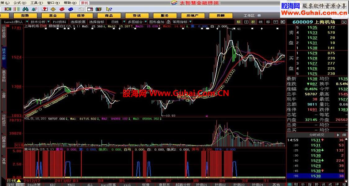 4、黑白买点:以黑码、白马起涨的第一天收盘价为支撑点,设为黑、白买点;