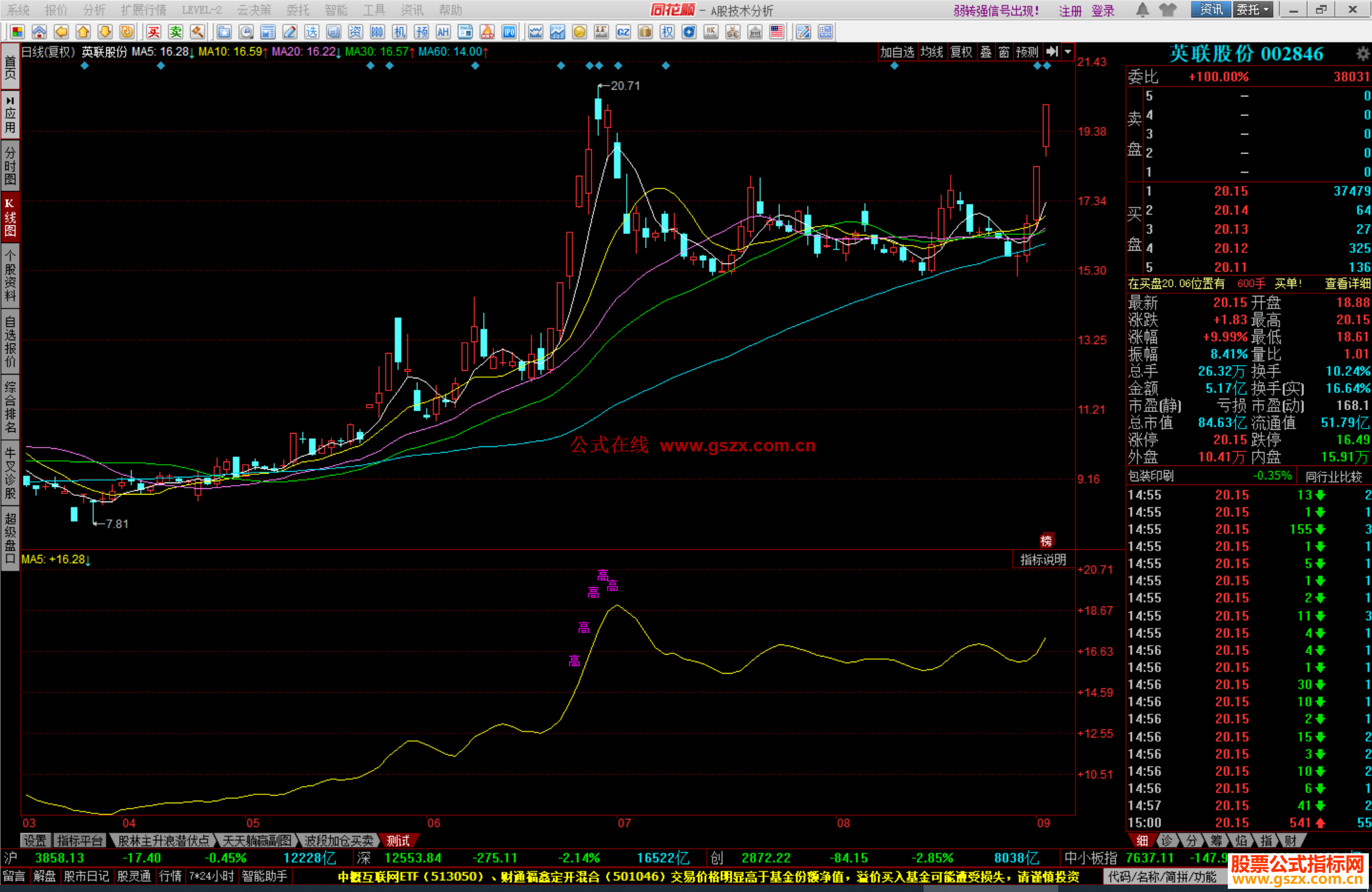相关简介:MA5: MA(CLOSE,5); V11:= MA(CLOSE,5)=HHV(MA(CLOSE,5),120); V21:= MA(CLOSE,5)MA(C,120); V31:= COUNT(MA(CLOSE,1)REF(CLOSE,1),3)=3; DRAWTEXT(V11 AND V21 AND V31,H,'高'),colorff00ff;
