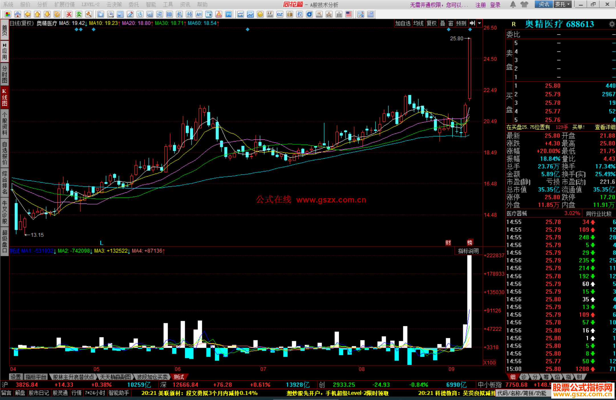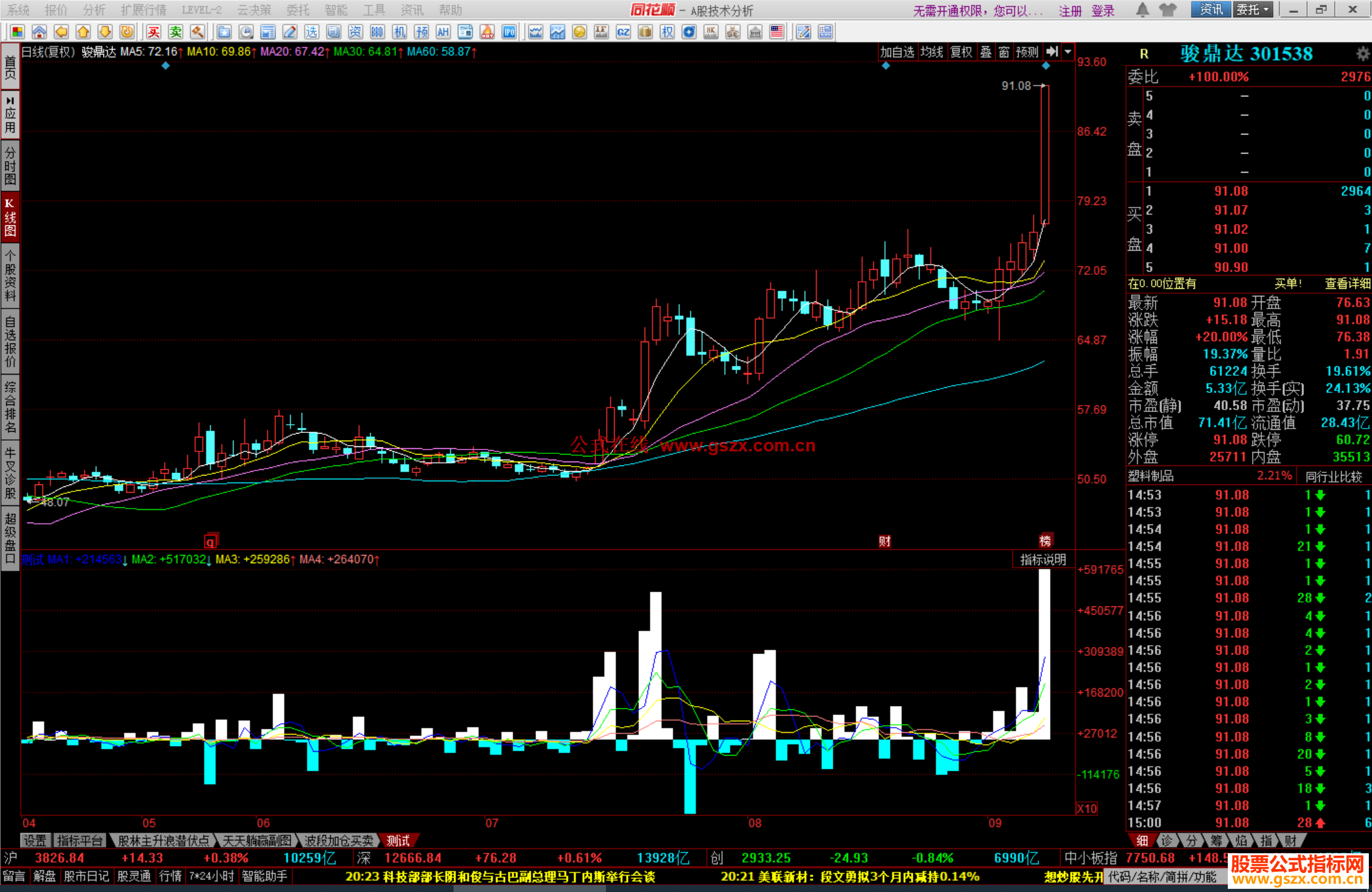 买量:=IF(CLOSE>OPEN,AA*(HIGH-LOW),IF(CLOSE 卖量:=IF(CLOSE>OPEN,0-AA*((HIGH-CLOSE)+(OPEN-LOW)),IF(CLOSE 大单动向:=买量+卖量; STICKLINE(大单动向<0,0,大单动向,10,0),colorcyan; STICKLINE(大单动向<0,0,大单动向,8,0),colorcyan; STICKLINE(大单动向<0,0,大单动向,6,0),colorcyan; STICKLINE(大单动向<0,0,大单动向,4,0),colorcyan; STICKLINE(大单动向>0,0,大单动向,10,0