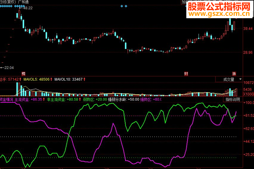 当主流资金摆脱非主流资金上攻,且上穿50,表示主力在投入资金,股价上涨。当主流资金在80以上运行一段时间之后,向下穿越80,显示主力减仓股价可能走弱。